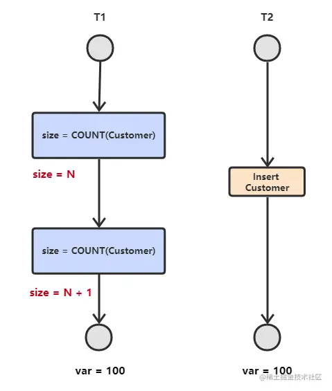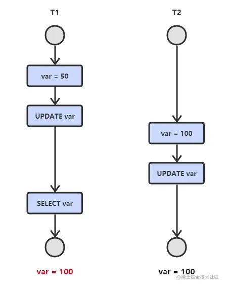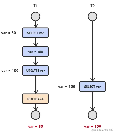 - 事务2返回,结果为A=100,但实际A=50,发生不一致;
