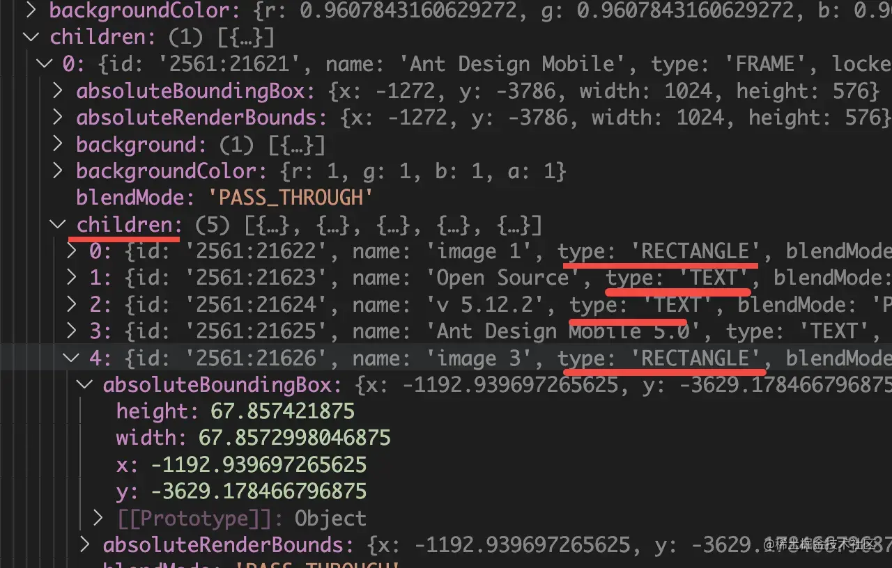 前面调研过 D2C,也就是设计稿转代码,它的原理是 figma、sketch 等插件可以拿到设计稿的数据,因为是矢量设计稿,所以存储的是一个 JSON,类似这样: