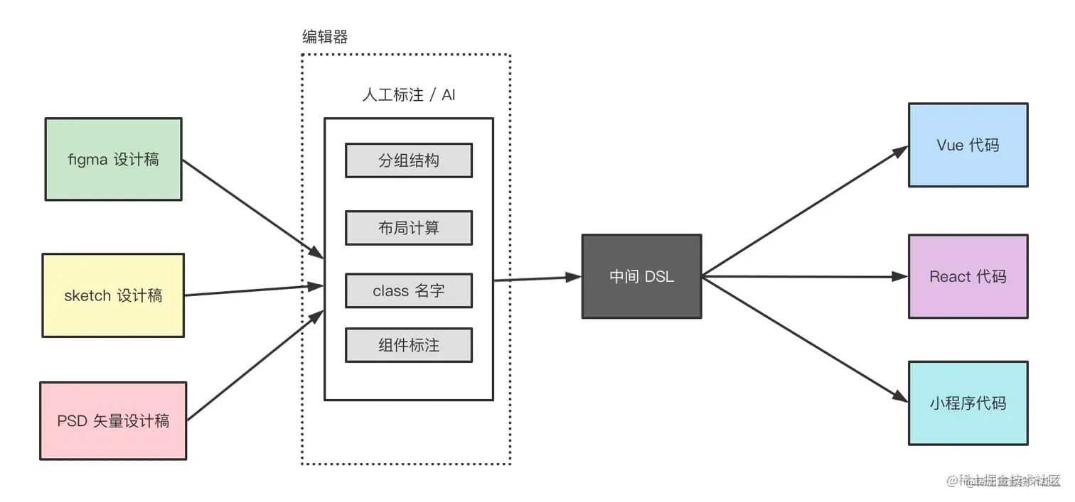 而且这个结构和网页的基础组件是能对应上的,也就能完成到网页的转换,然后通过不同的模版,打印成 React、Vue 等不同框架的代码。