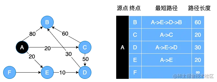 上面两个图就是有向图和无向图中顶点 A 到不同顶点的最短路径。