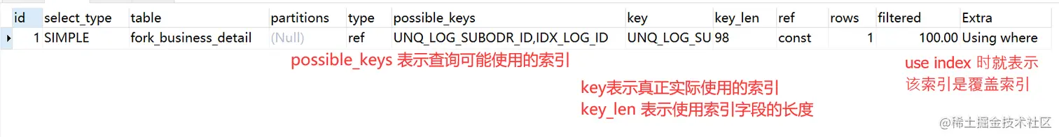 Extra 显示 use index 时就表示该索引是覆盖索引,表示该索引是覆盖索引,通常,性能排序的结果是usd index>use where>use filsort