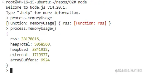 回到这一部分,介绍一个比较常见的命令:我们在node中输入process.memoryUsage(),就可以很方便地查看node内存使用量的相关信息: