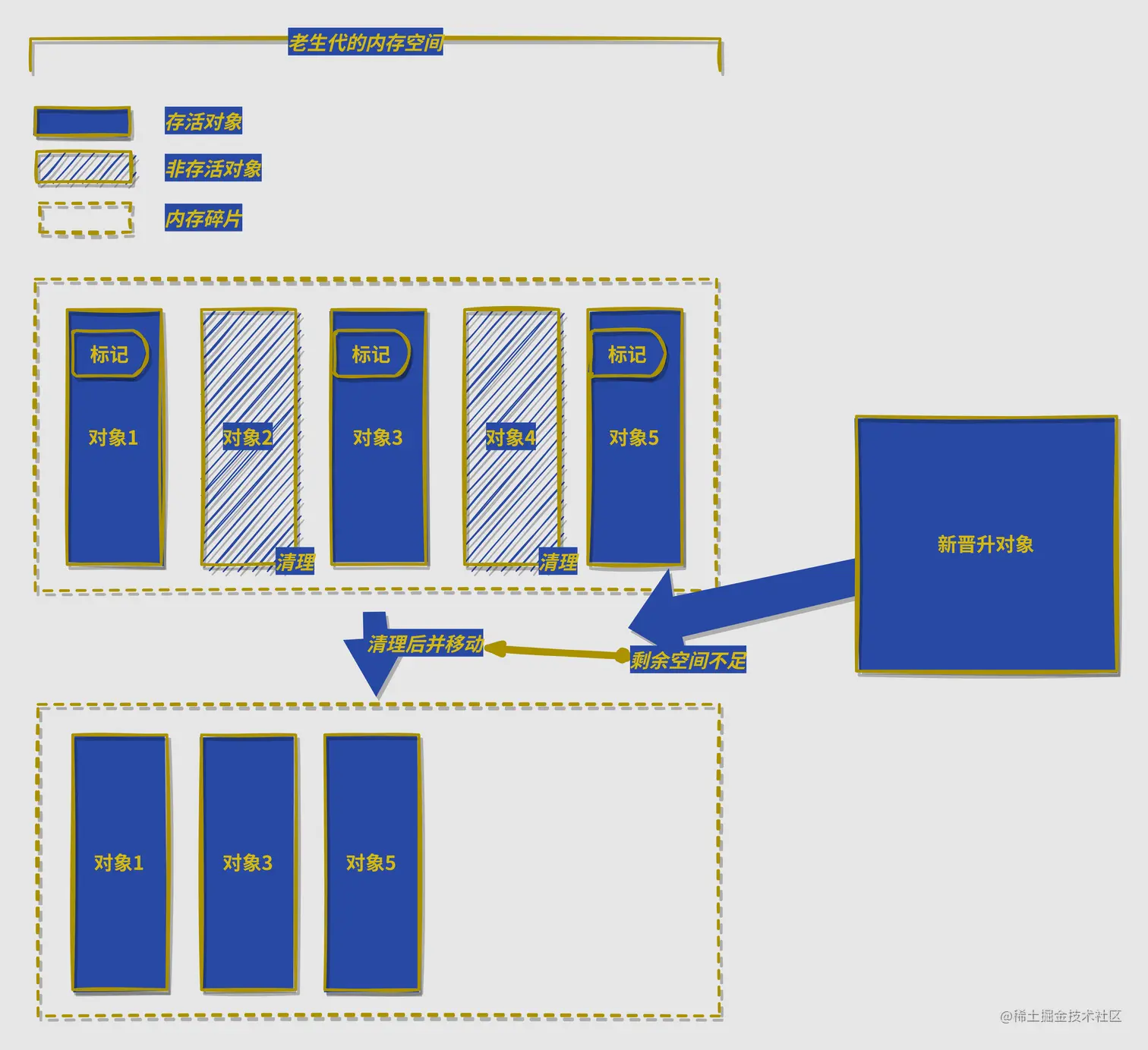 所以在取舍中,V8主要使用标记清除算法,在空间不足以对新生代晋升过来的对象进行分配的时候才使用标记整理算法(如下图)