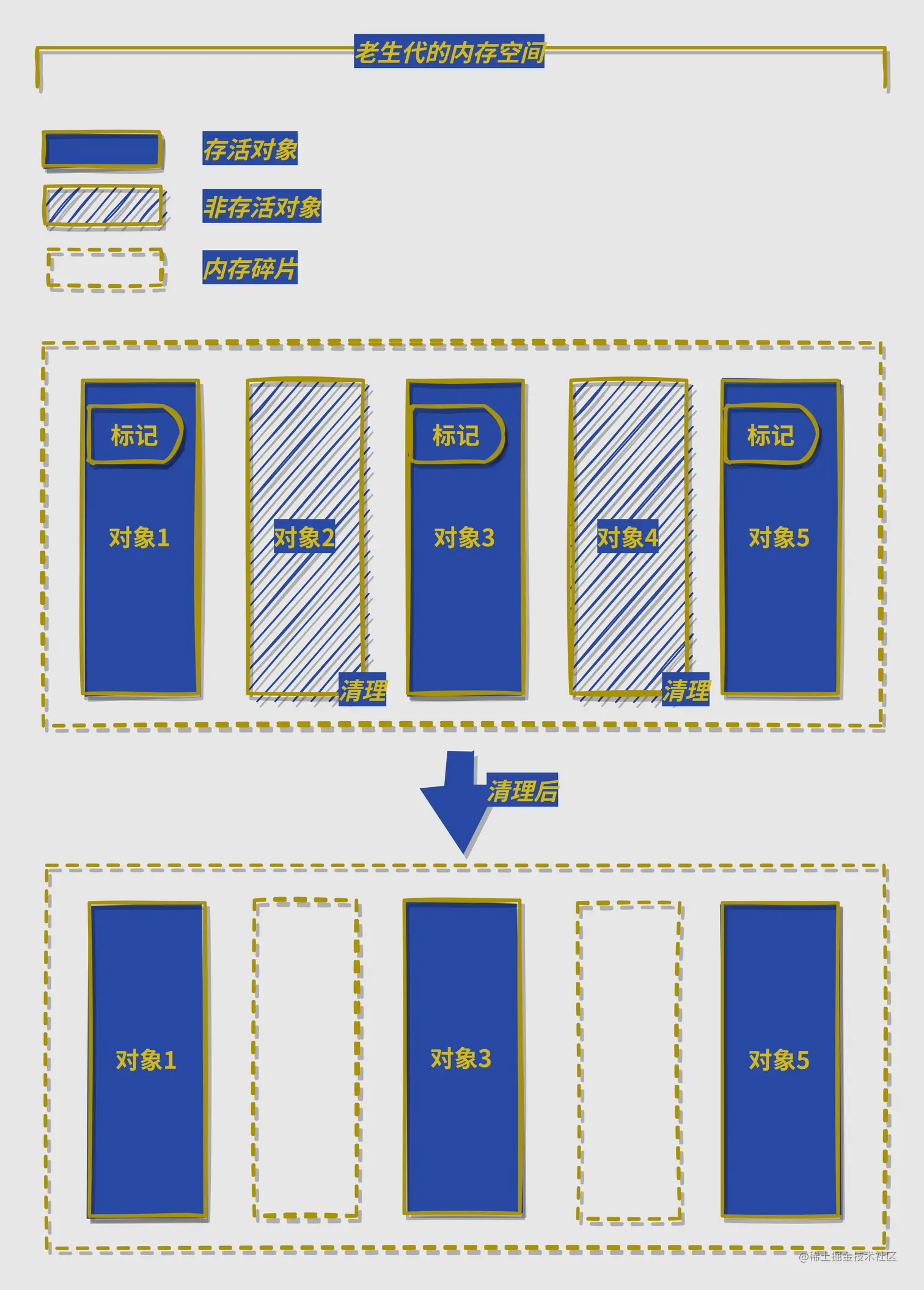 老生代的特点就是存活时间长,即失活对象的占比一般来说是比较小的,所以这里是清除死亡的对象是合理的。而不是与新生代算法一致,复制活着的对象,并且由于老生代对象占用内存较大,所以分出一半空间来说也是不合理的