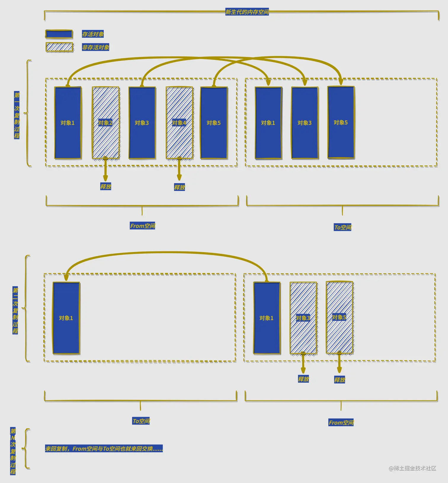 该算法主要采取复制的方式进行的垃圾回收,如下图所示: