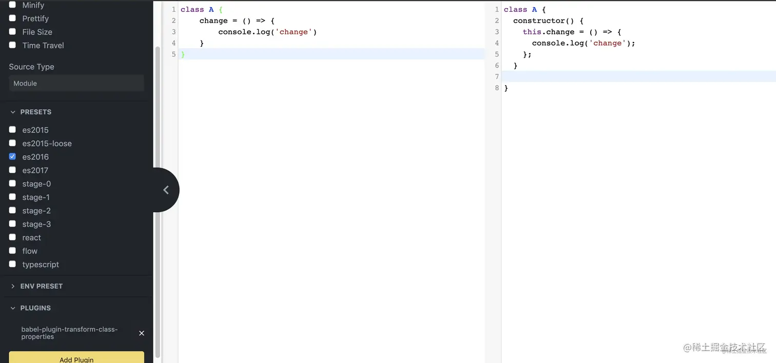 我们在babel上做一下编译:点击class-properties(选择ES2016或者更高,需要手动安装一下这个pluginbabel-plugin-transform-class-properties相比于@babel/plugin-proposal-class-properties更直观,前者是babel6命名方式,后者是babel7)