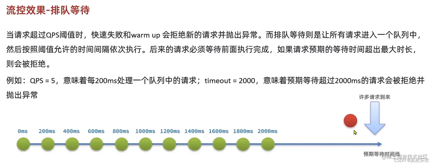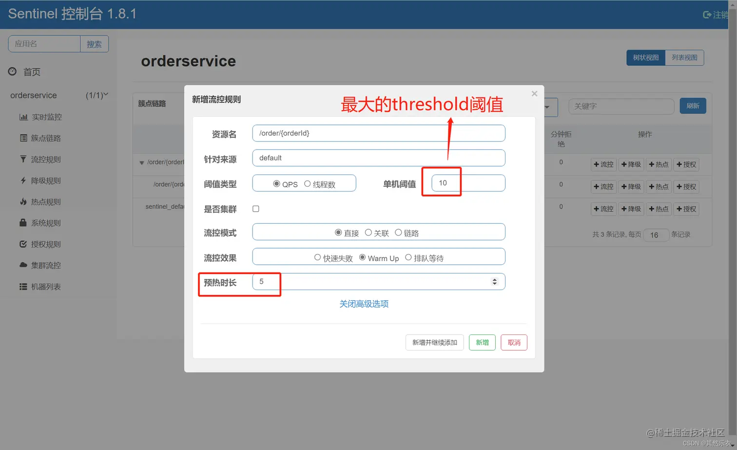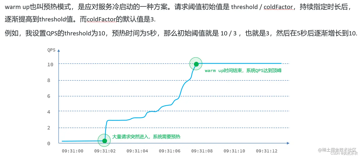 warm up也叫预热模式,是应对服务冷启动的一种方案。请求阈值初始值是 threshold / coldFactor,持续指定时长后,逐渐提高到threshold值。而coldFactor的默认值是3.