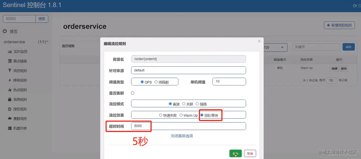 • warm up:预热模式,对超出阈值的请求同样是拒绝并抛出异常。但这种模式阈值会动态变化,从一个较小值逐渐增加到最大阈值。