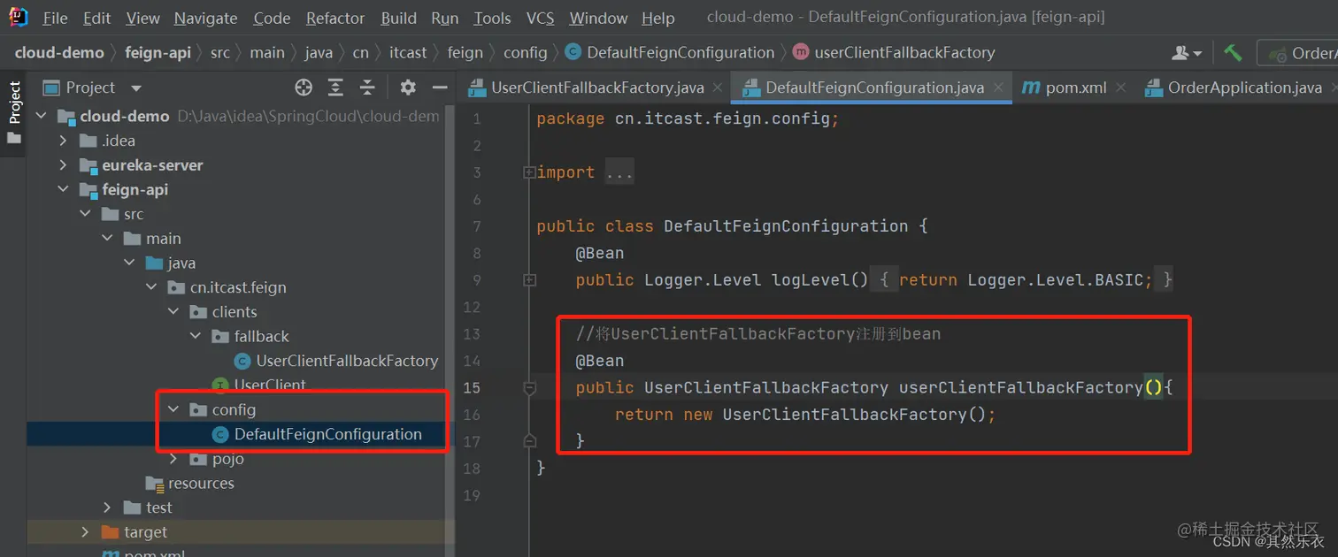 步骤二: 在feing-api项目中的DefaultFeignConfiguration类中将UserClientFallbackFactory注册为一个Bean: