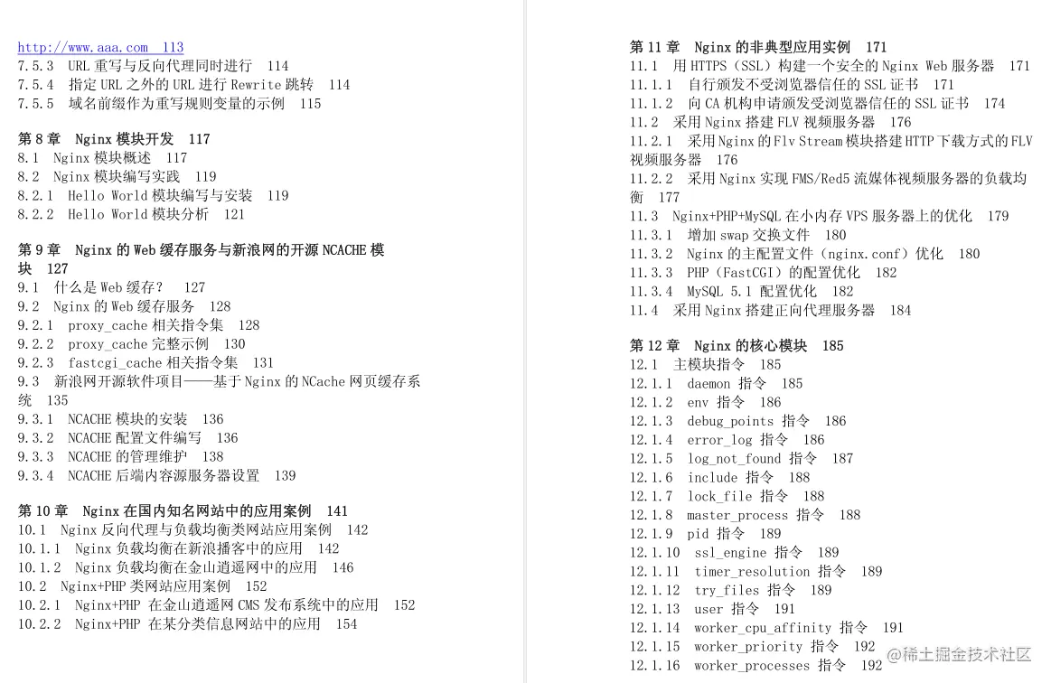 此章节也是必要重要的,主要介绍了Nginx的各类模块,分为核心模块、标准HTTP模块、可选HTTP模块、邮件模块、第三模块和补丁。