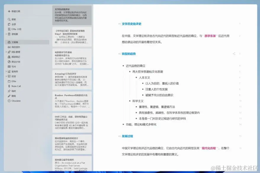 Effie 支持多平台互通、使用完全免费。软件的操作也很简单,学习成本不大,几分钟就能上手。Effie 走的是极致简约风,主界面同样采取三栏式设计,左侧的毛玻璃设计让创作者更多地将重心放在编辑界面上,十分简洁高档,写作的时候可以单独显示编辑页面,杜绝干扰 ;自动保存,这个功能真的太赞了,完全不用担心文稿丢失,可以更加投入在写稿当中;文件传输也很方便,支持️ PDF , DOCX ,图片三种格式,一键导出效率超高。