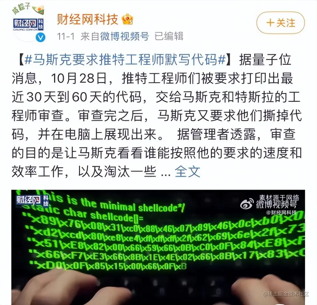 至少曾经我听过太多人吐槽写代码的永远干不过写PPT的,并且在现实工作中验证过也确实如此,但是老马的这一波骚操作,让推特工程师打印出最近30-60天的代码,并审查后撕掉代码,且在电脑上展示出来,让我似乎看到了这个行业某些其他东西。