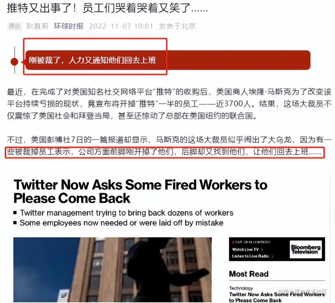 我相信这20%的人在这波推特裁员中,肯定能留下来,应该没人会质疑,除非老马想来个彻底洗盘,不信你看环球时报的这则新闻:《 刚被裁,人力又通知他们回去上班!》 因为一些员工工作领域和经验其实是“推特”仍然需要的,但管理层在裁掉了他们后才意识到这一点。所以,有技术到哪都是底气。