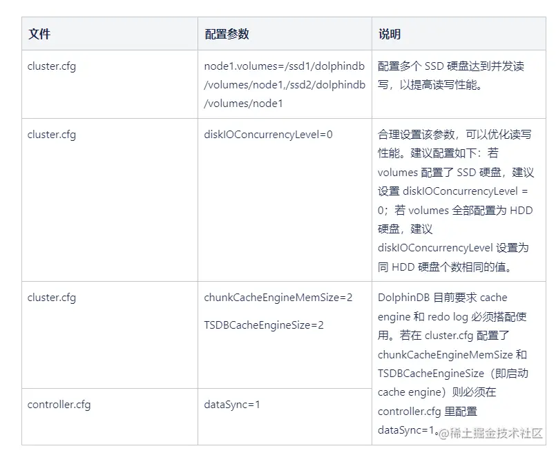 diskIOConcurrencyLevel=0 node1.volumes=/ssd1/dolphindb/volumes/node1,/ssd2/dolphindb/volumes/node1 node1.redoLogDir=/ssd1/dolphindb/redoLog/node1 node1.chunkMetaDir=/ssd1/dolphindb/metaDir/chunkMeta/node1 node1.TSDBRedoLogDir=/ssd1/dolphindb/tsdb/node1/redoLog chunkCacheEngineMemSize=2 TSDBCacheEngineSize=2 ...