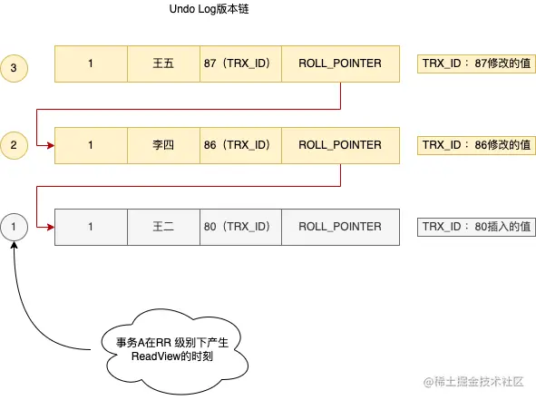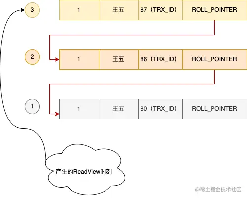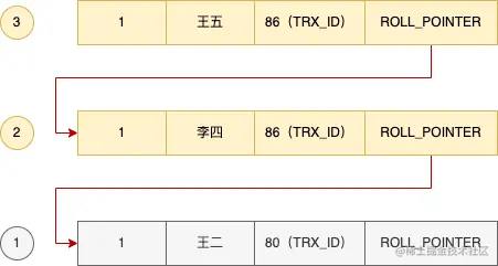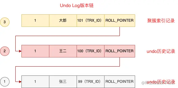 他们所生成的版本链如下图:注意,并不是指向id为1的位置,只是为了方便,实际指向该记录在Undo Log 文件里的字节偏移量(就是从文件开始读多少多少个字节是这条历史记录)。