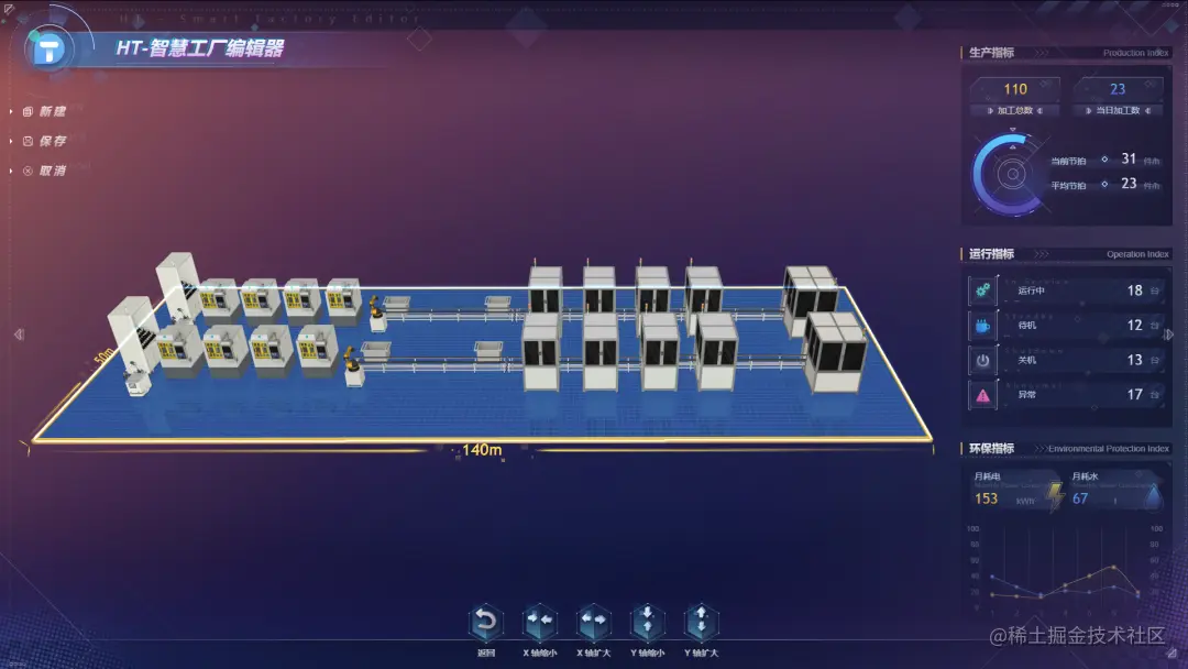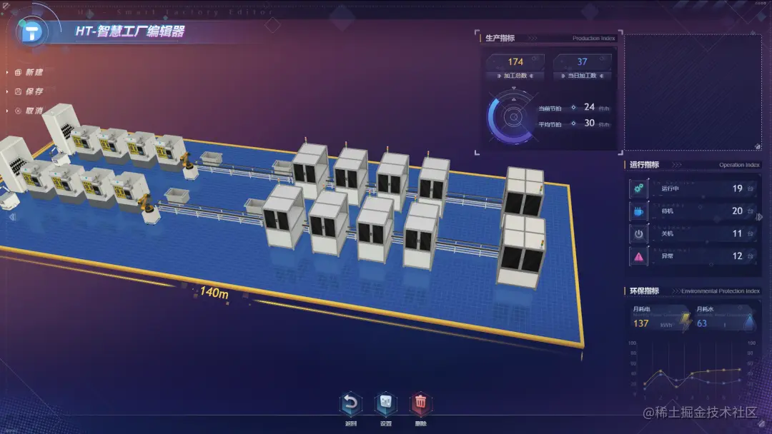 图扑智慧工厂编辑器内图表包含生产指标、运行指标、环保指标三个按钮,点击可弹出相应图表框,可自由移动位置。为图表接入数据后能查看工厂的产品生产数量、设备运行数据、二氧化碳排放量等信息,还能设置刷新速度。通过记录物料使用时间、加工进度、能源消耗等信息,给车间管理人员提供定单和计划完成情况的分析;还可以把物料消耗、人力成本通过财务体系融合进来,及时归集整个车间的运营成本。