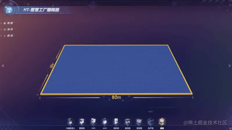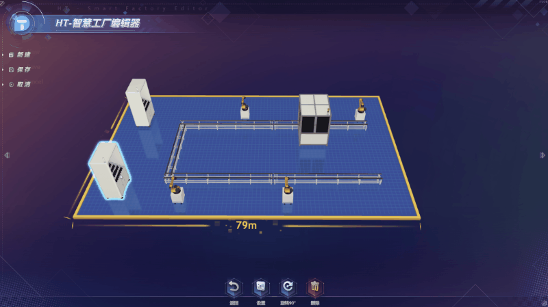 示例模型包含六轴机器人、雕刻机、CNC、AGV、物料库、抛光机、清洗槽、生产线。每个模型可进行参数设置,如名称、长度、宽度、高度、染色等,还能进行旋转和删除,模型位置可自由移动。编辑器采用积木式结构,用户只需要简单地组合,便可灵活地搭建车间内产品生产工艺流程。