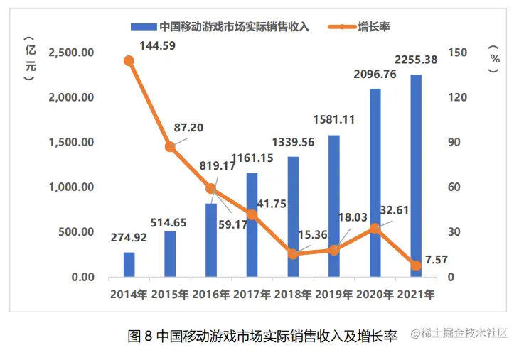 伽马数据显示,2021年中国移动游戏用户相较于2020年仅增长0.2%,在用户数量增长上几乎陷入了停滞状态;同时,2022年第一季度中国游戏市场实际销售收入794.74亿元,同比增长3.17%,低于去年同期同比增长率。从整体上看,在2021年的中国游戏产业报告中显示,除了2020年受新冠疫情影响,中国移动游戏市场销售收入同比增长率出现短暂较大回升之外,总体大致呈逐年下降趋势,至2021年,销售增长率仅为7.57%。由此表明现如今国内游戏市场发展空间狭窄,已呈现疲软态势。