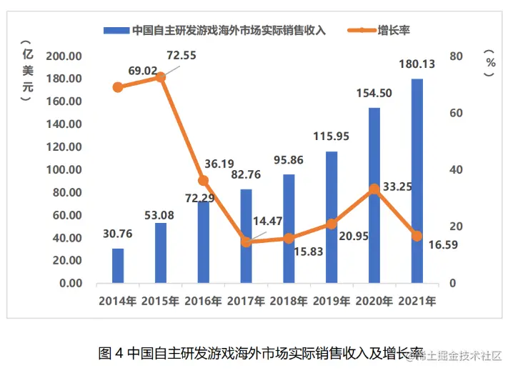 随着国内流量红利的见顶,拓展海外市场已是大势所趋。根据2021年中国游戏产业报告,近五年中国游戏出海的份额呈稳定上升的趋势,出海游戏在用户下载量、使用时长和用户付费三个方面均保持较好的增长。2021年,中国自主研发游戏的海外市场销售收入达到180.13亿美元,同比增长16.59%。出海涉及的国家和地区逐步增多,产品类型也更加多元。据预测:2024年出海手游收入规模将为2021年的1.6倍,未来两年内的市场空间增长达62%。可见,游戏出海市场前景广阔,呈蓬勃发展态势。