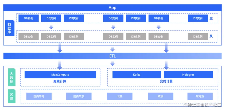 如下图所示,易仓科技的数据库主要使用主从架构,然后通过 ETL 将全链路打通,大数据可汇总至离线计算或实时计算供业务使用。因为是跨境业务,所以我们的服务器在国内外都有部署。