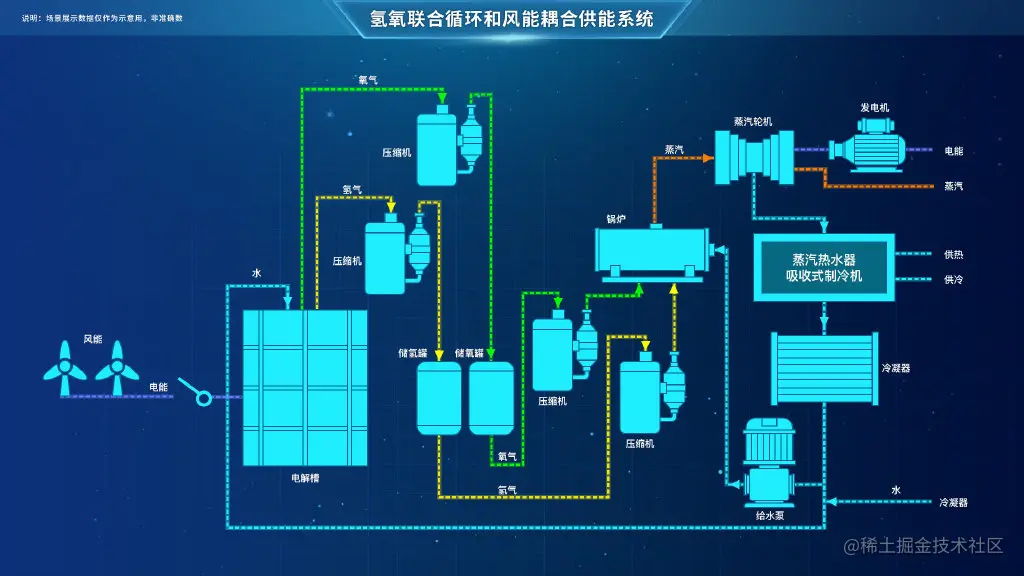 Sovit2D 运用 2D 组态图的方式科普垃圾发电的工作原理,管理人员能够更直观看到各系统的工作状态、检测信息,包括垃圾仓发酵时长,垃圾仓负压、烟气炉膛停留时间温度、DCS 炉膛温度,汽轮机温度等,场景内点击“组态工艺”即可下钻切换。不同维度的数据可视化流程图,满足不同管理运营人员的业务诉求。