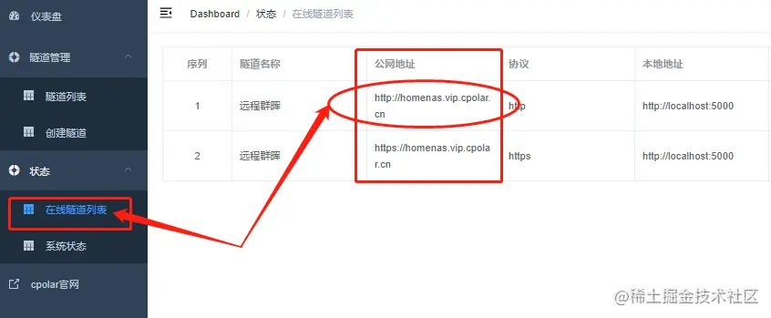 在这个例子中,我们就可以在“在线隧道列表”页面中找到本地群晖页面的公共互联网地址(即内网穿透数据隧道的入口),我们可以通过这个地址,长期稳定的在远程设备上访问到位于内网的群晖系统。