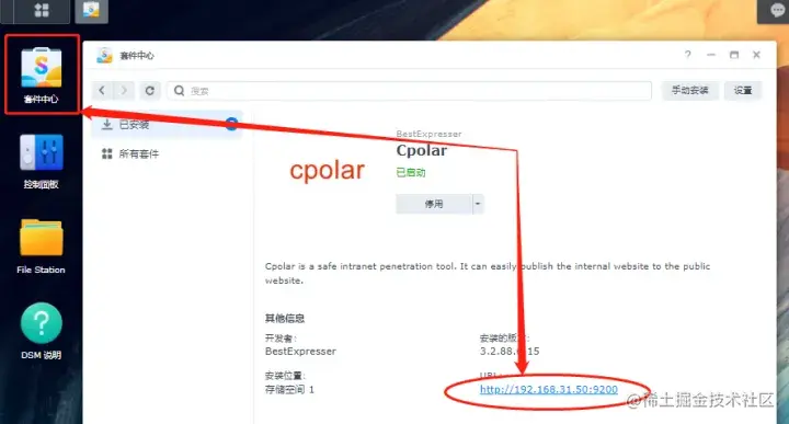 在群晖系统中,我们可以从“套件中心”中打开cpolar(在群晖NAS中安装cpolar的方法,可以参见我们以往的文章《如何在群晖系统中安装cpolar》)。