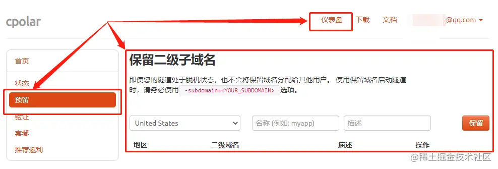首先登录cpolar的官网,在“仪表盘”左侧的“预留”页面中,找到“保留二级子域名”项(预留二级子域名需要升级cpolar至VIP及以上级别)。