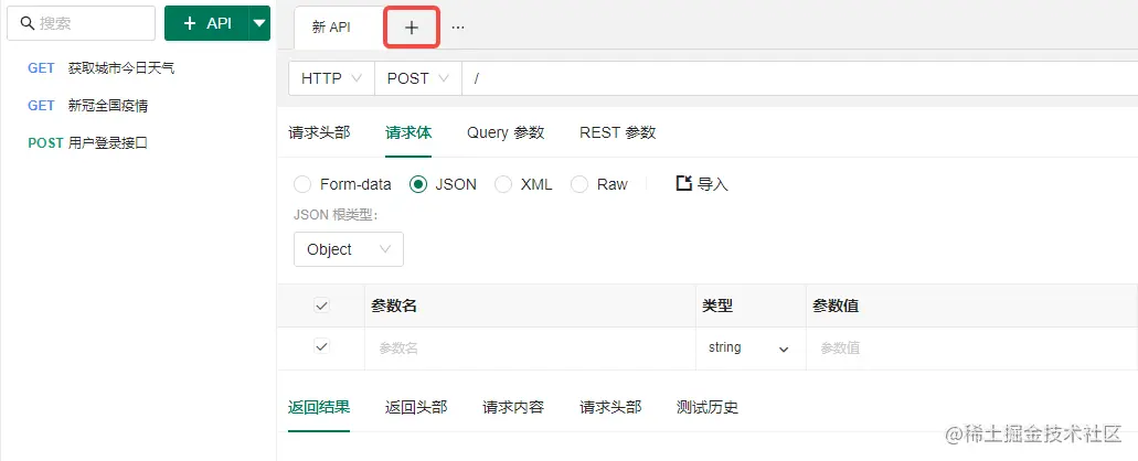 开始测试之前,我们需要先填写测试数据~,可以点击标签页的加号新建一个测试标签页。