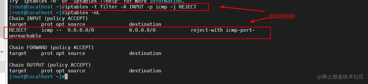 iptables -t filter -A INPUT -p icmp -j REJECT 禁止ping通本主机(有响应)