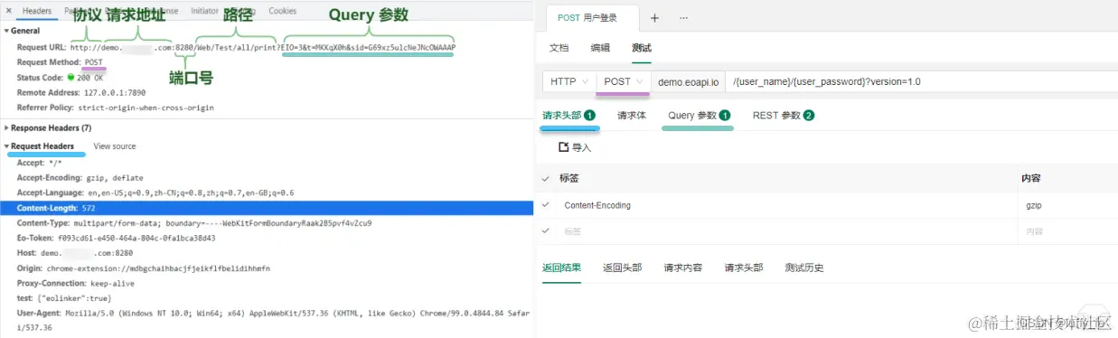 通过类比现有的知识去学习新的知识往往更快,平时我们一般会在浏览器里看 API 请求信息,这些信息在 Eoapi 对应的位置是什么呢?相信通过下面的对照图你很快能知道如何在 Eoapi 测试: