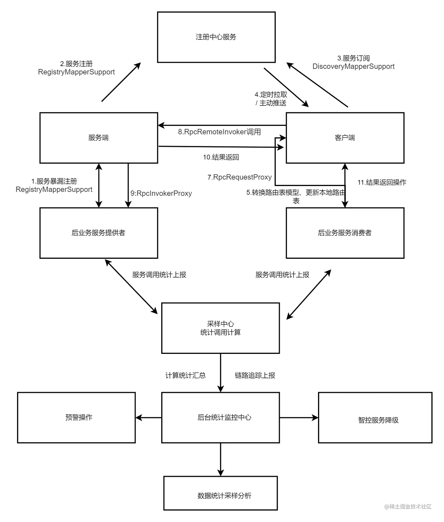 相信每一个软件公司(企业)都希望可以确保开发及项目运行流程可以顺利,但是如果要完美完结那么需要其中会有很多的因素存在。包括,最佳实践、架构原则、服务治理以及其他决定性的因素。而其中服务治理指的是⽤来管理SOA(微服务)所采⽤和实现的重要环节和因素。下图就算是一个较为完整得RPC模型得服务治理体系机制。