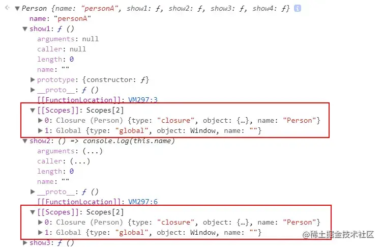 故而personA的show2方法因为构造函数闭包的关系,指向了构造函数作用域内的this。而