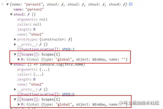 我们发现与之前字面量声明的相比,show2方法的输出产生了不一样的结果。为什么呢?虽然说构造方法Person是有自己的函数作用域。但是对于personA来说,它只是一个对象,在直观感受上,它跟第一道题中的person1应该是一模一样的。 JSON.stringify(new Person('person1')) === JSON.stringify(person1)也证明了这一点。