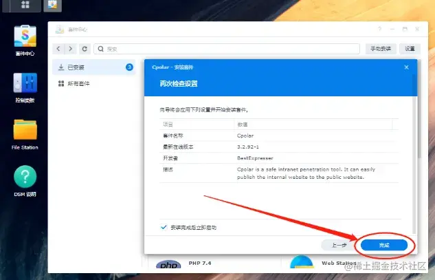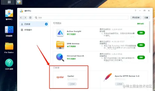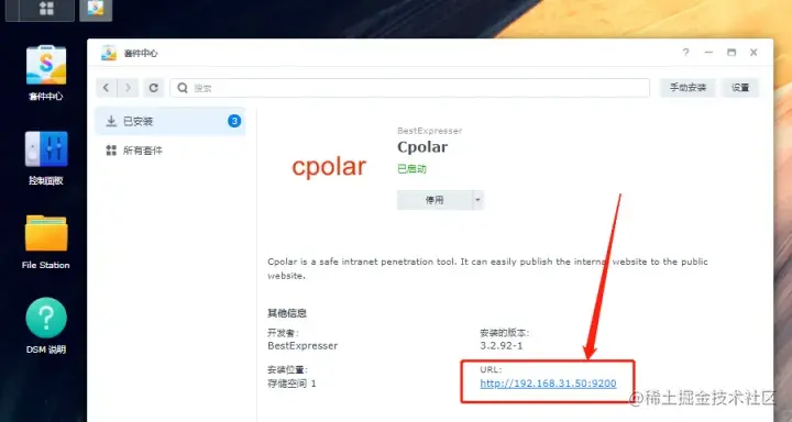 只需要等待很短时间,cpolar就能在群晖系统中安装成功。此时我们点击cpolar套件,就能看到群晖系统内cpolar的详细信息。