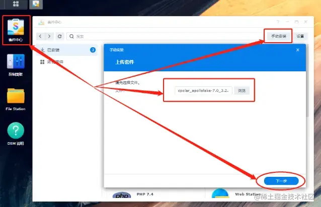 在找到合适的cpolar版本后,就可以点击页面下方的“下载”按钮,将cpolar下载到本地。在cpolar在群晖的安装文件下载完毕后,我们就能通过“套件中心”,选择“手动安装”模式,在跳出的文件选择窗口选择cpolar安装文件的存放路径,再点击“下一步”。