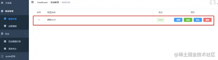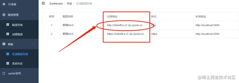 在各项均填写完毕后,即可点击下方的“创建”按钮,即可创建一条临时的内网穿透数据隧道,让我们能通过这条数据隧道,在公共互联网上访问到局域网内的群晖NAS。而这条内网穿透数据隧道,我们可以在cpolar主界面左侧“状态”项下的“在线隧道列表”页面,找到内网群晖的公共互联网地址。