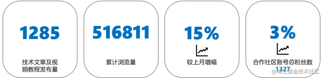 截至2022年10月27日,9个合作社区共发布内容(含技术文章、视频教程)1285篇,累计获得总PV/UV数516811,同比上月增长15%,账号获得粉丝数1327人,较上月增幅3%。