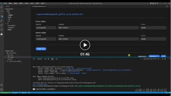 最后,当OpenHarmony源码下载完成后,开发者可以通过Project Tasks > Config进入到可视化配置界面,只需要配置vendor和device代码仓的地址,再选择对应的支持,点击右下角的克隆远程仓库,Device Tool即可自动将配置添加到配置文件中,然后拉取开发者配置的代码仓中的代码。