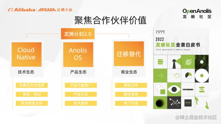 第一个是技术生态。去年我们发布了龙腾计划,希望从技术、产品、商业三个方面来整体地提升社区合作伙伴价值,作为一个操作系统开源社区,我们将通过生态发展以及技术协作,让龙蜥操作系统具备非常大的技术竞争力,这是社区发展的基本盘。