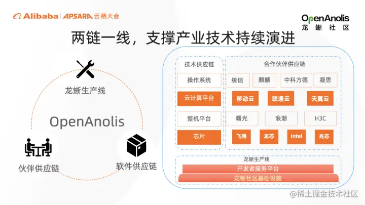 除人才之外,对龙蜥社区而言,产业技术的持续演进也十分重要,包含了软件供应链、伙伴供应链,以及龙蜥生产线等概念。我们认为软件供应链更多解决的是生产资料的问题。龙蜥社区的理事单位、生态伙伴,以及高校和科研机构一直在共建软件供应链安全的项目,通过对漏洞信息库,包括代码版本的信息库、代码安全的信息库、CBE、安全中心的建设,希望能够帮助我们所有参与龙蜥社区的企业,解决掉在软件供应链安全方面的一些问题和困扰。在解决了生产资料的问题之后,另外一个就是要解决生产关系的问题。前面我也提到了整个操作系统的产业链条是很长的,龙蜥社区集合了云厂商、芯片厂商、服务器厂商、应用厂商等等产业上下游多重角色,希望通过龙蜥社区生态形成一条完整的全链路的解决方案,帮助企业用户更好地解决一些生产过程中遇到的问题。