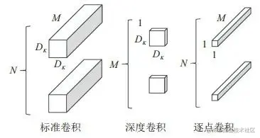 假设输入的特征映射F尺寸为(DF,DF,M) , 采用的标准卷积K 为(DK,DK,M,N) , 则输出的映射G 尺寸为(DF,DF,N) . M 为输入通道数, N 为输出通道数, 对应的计算量为