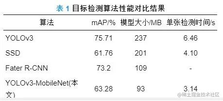 表 1为YOLOv3目标检测算法、基于MobileNet的目标检测算法和其他检测算法实验对比结果.