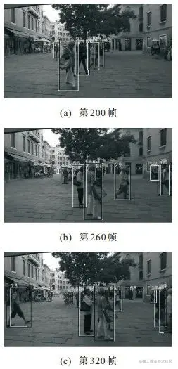 由表 2可见: 本文算法的MOTP值与YOLOv3-Deep-SORT算法相差不大, 但均高于表中其他算法; 被跟踪的轨迹比例(MT)相比YOLOv3-Deep-SORT算法有所上升, 跟丢轨迹占比(ML)有所下降, 均优于TC_ODAL和RMOT算法; ID变换次数低于表中前4个算法(即TC_ODAL、RMOT、SORT、MDP), 但相比YOLOv3-Deep-SORT算法有所上升; 帧频率提高为该算法的3倍, 检测跟踪时间提高显著. 本文算法虽然在跟踪准确度、ID变换次数和误报总数上不及YOLOv3-Deep-SORT算法, 但其他跟踪指标均优于该算法, 并且本文算法相比于TC_ODAL、RMOT和SORT等算法优势明显. 为进一步表现本文算法的优越性, 以ID标号为3的目标为例, 给出如图 4所示的部分跟踪结果, 且跟踪框上带有数字ID标识. 由图 4可见, 该算法在第200帧、260帧、320帧均能连续跟踪, 跟踪效果良好.