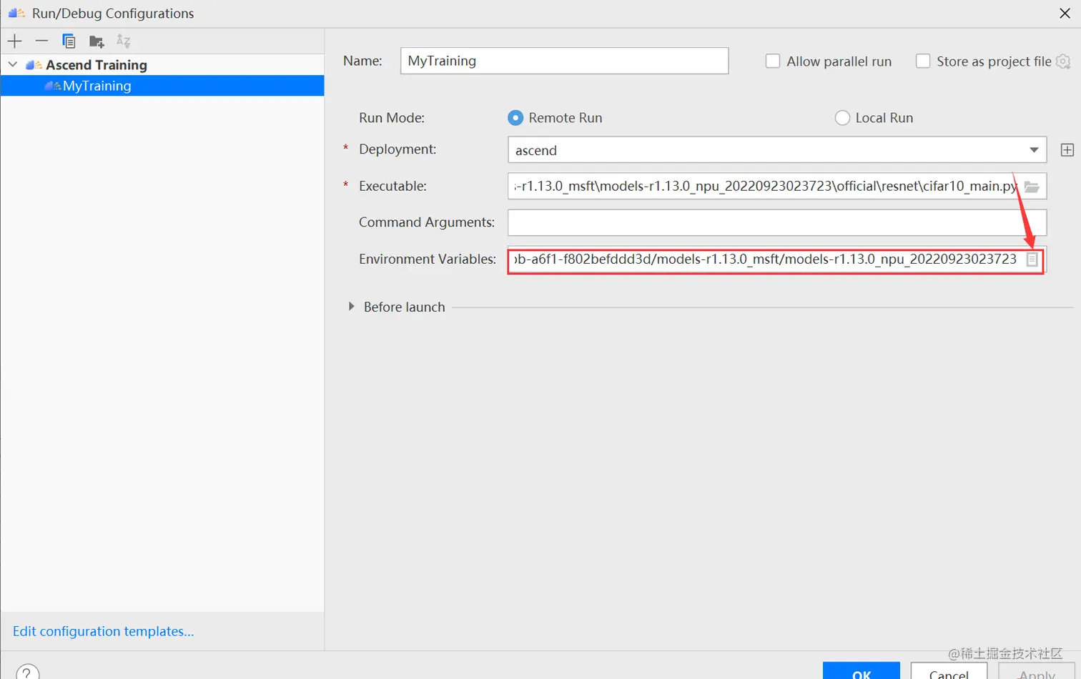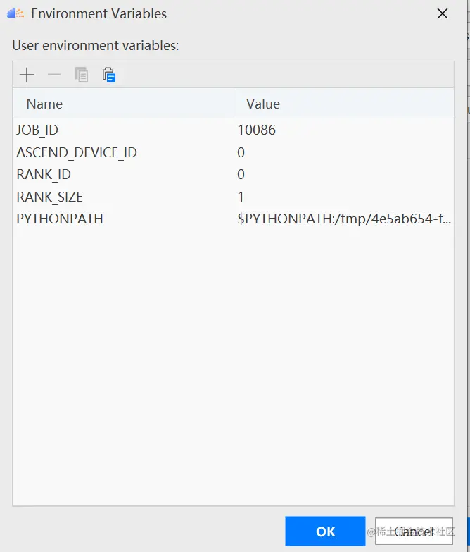 配置环境变量,打开下图所示界面,配置训练进程启动依赖的环境变量,参数设置完成后,单击“OK”,环境变量配置说明请参见下表。