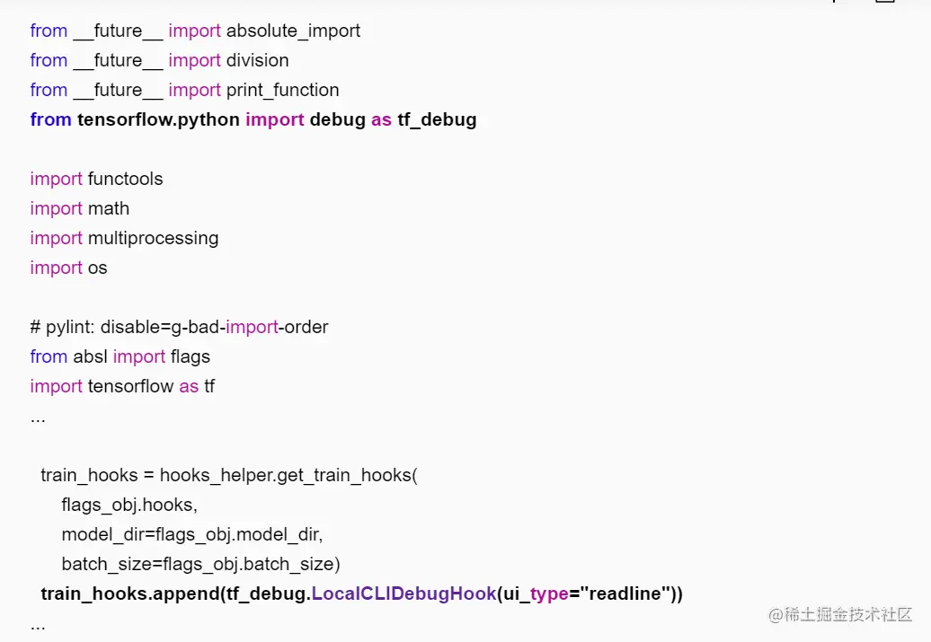 进入训练脚本所在目录(如“~/models/official/resnet”),修改训练脚本,添加tfdbg的hook。编辑resnet_run_loop.py文件,添加如下加粗字体的信息。