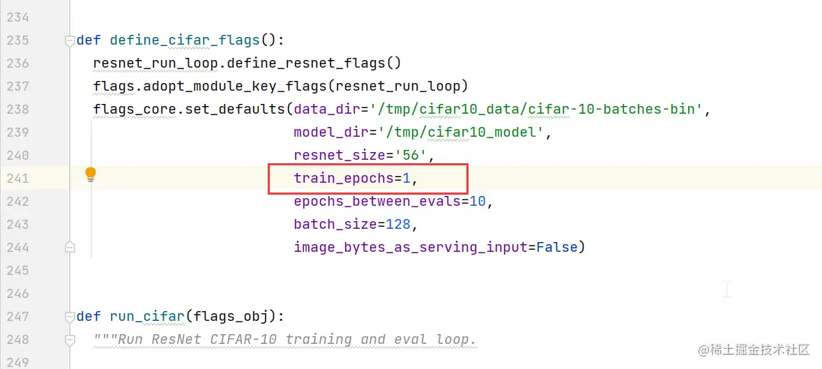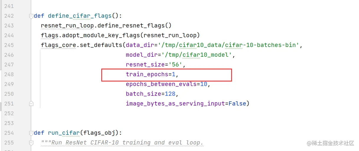 编辑cifar10_main.py文件,将train_epochs的值改为1。